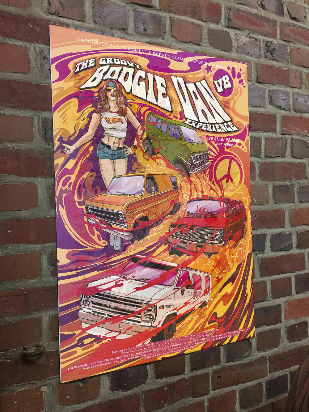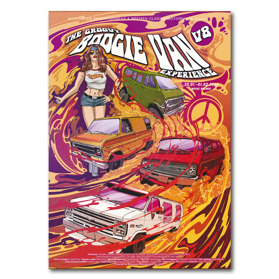 In dieser Sonderausstellung zeigt der Motoraver Verlag vier Boogie Vans der Marken Chevy, Ford und Dodge aus den 1970er Jahren, inklusive zeitgenössischem Zubehör. Die Fahrzeuge nehmen den Besucher mit in eine Zeit, in der Custom-Umbauten ein individuell-buntes Lebensgefühl transportierten, lange bevor weiße Luxus-Vanlife-Massenware linke Autobahnspuren blockierte.